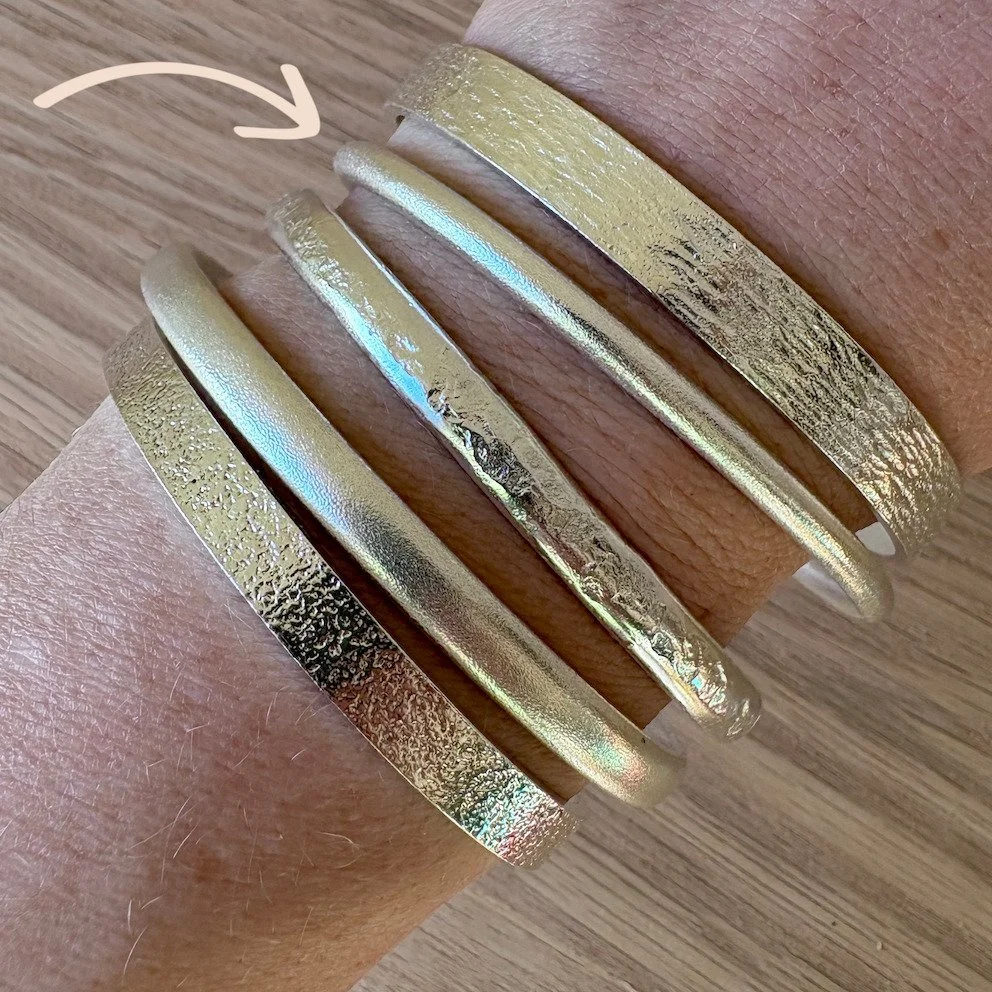 The D-shaped profile of the wire provides a broad surface to showcase this texture, while its low profile keeps the bangle lightweight - perfect for those who enjoy wearing their bangles every day yet still love a chunky look.